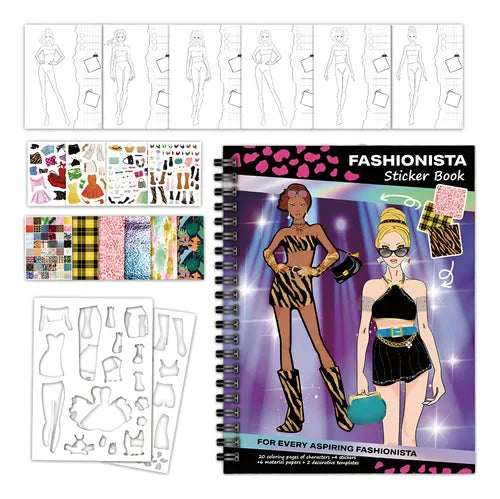 - The Fashionista Activity Sticker Book includes 20 coloring pages of characters, 4 stickers, 6 material papers, and 2 decorative templates.