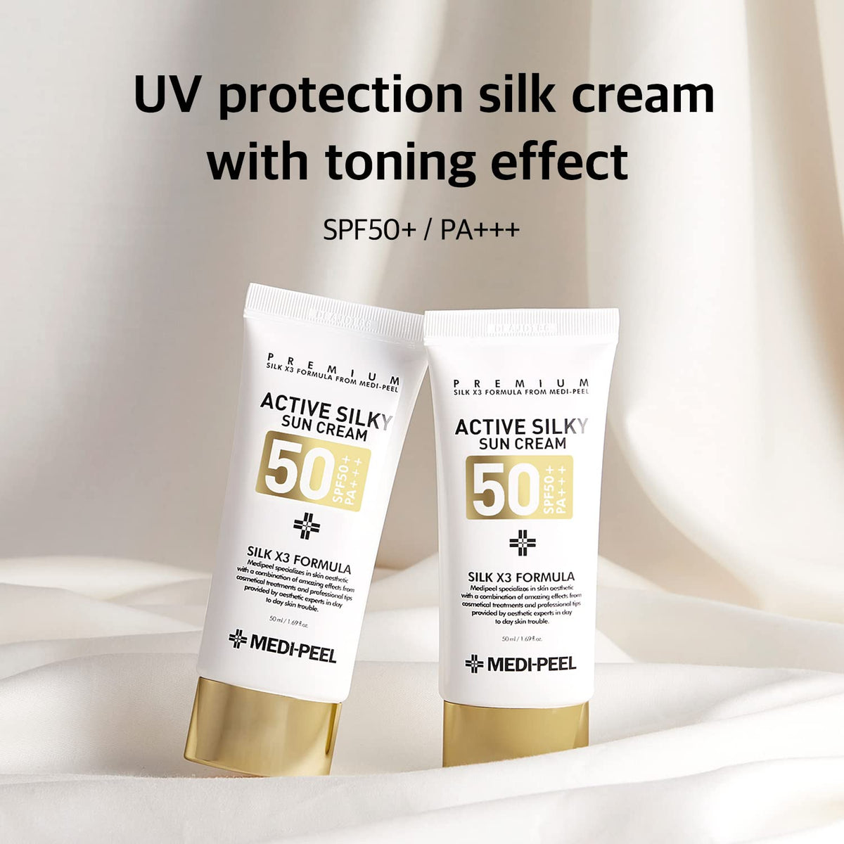 - With SPF50+ PA+++, the Active Silky Sun Cream blocks out UV-B and UV-A but balances the skin out with the 5 Peptide solution included in the product A sunscreen facial cream protects against the burning and aging effect from UV rays, leaving your skin moister and silky.