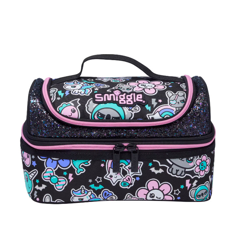 Make mealtimes a joy with this two-tier lunch bag from Smiggle. Features two insulated compartments with an easy zip fastening. Complete with a practical carry handle. Available in various designs.