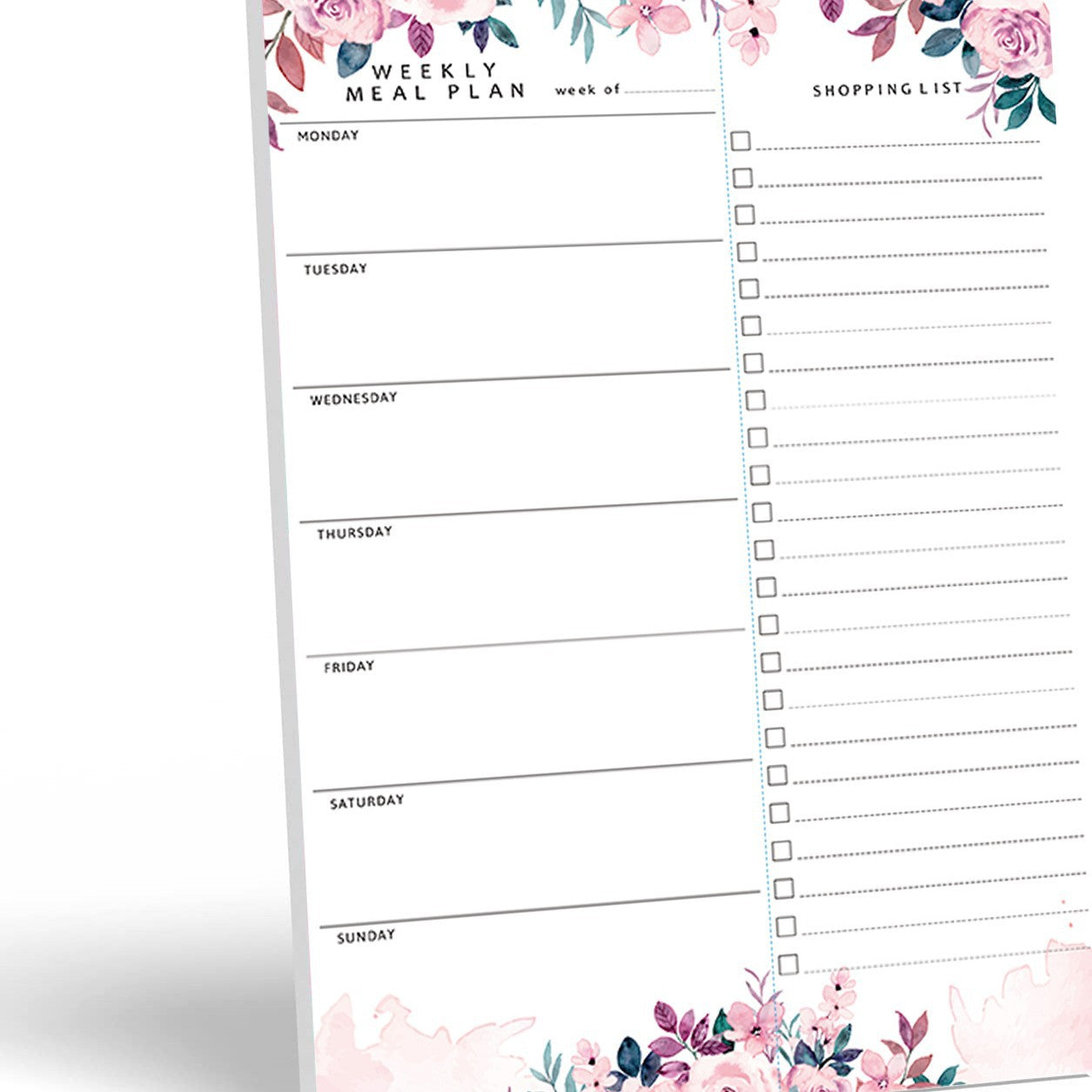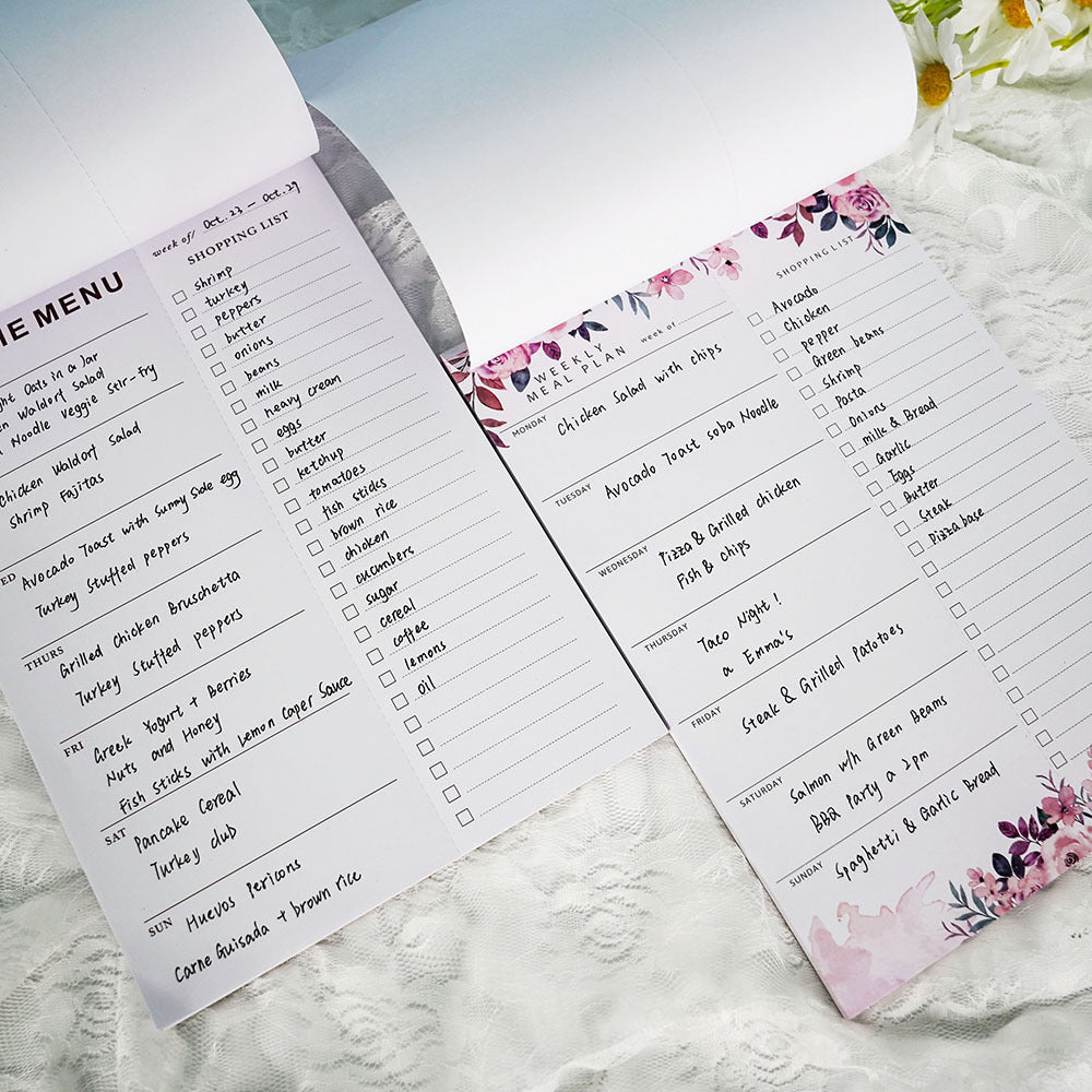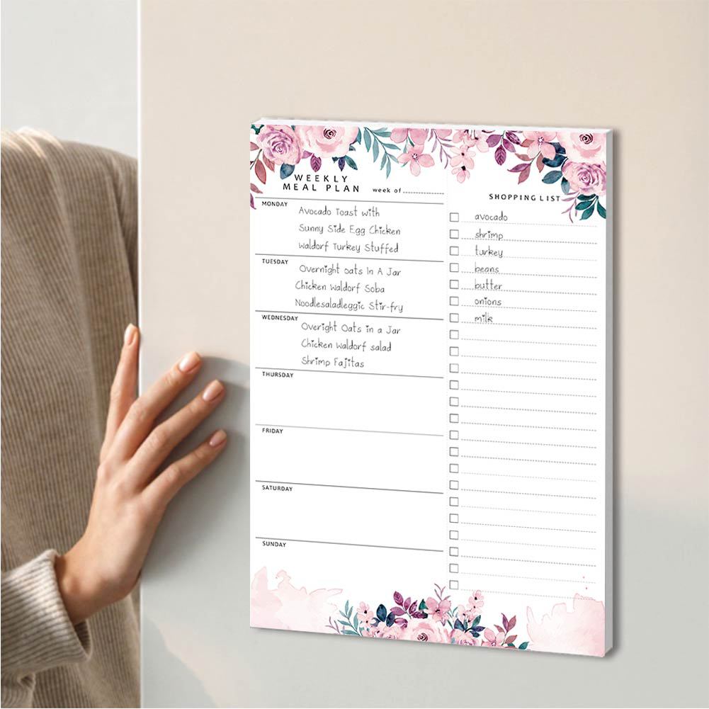 It is a 7x10” notepad designed for weekly meal planning and grocery list creation that features a tear-off shopping list for convenient use.